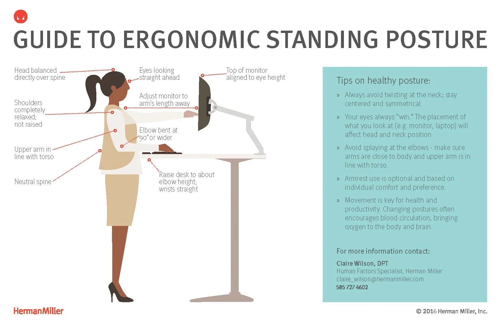 It's important to create a balance between sitting and standing. We shouldn't spend too much time sitting or too much time standing. The image above shows how we should be positioned while we stand to make sure we're not putting pressure on our eyes, our neck or any other part of our body.